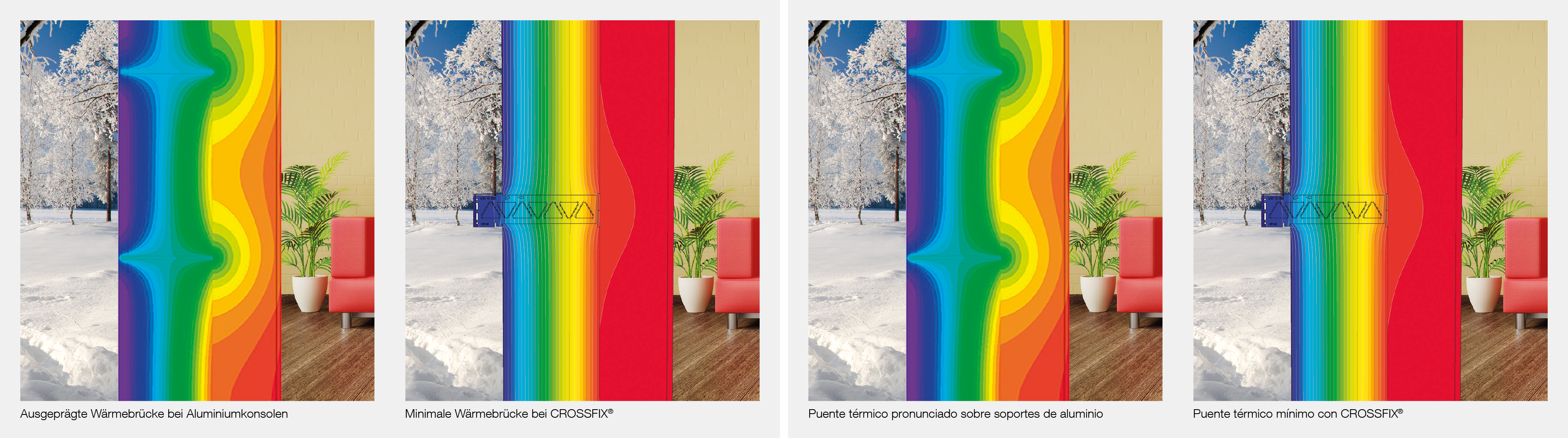 CROSSFIX® de EJOT es un sistema de subestructura para fachada ventilada. La ménsula está hecha de acero inoxidable (A2 o A4). El material permite una reducción significativa del puente térmico que supone el sistema, ya que tiene una conductividad térmica muy baja en comparación con el aluminio. Esta eficiencia energética de la subestructura puede permitir construir con un espesor de muro menor, gracias a la posibilidad de reducir el espesor del aislamiento y entonces del espesor del sistema de fachada ventilada.